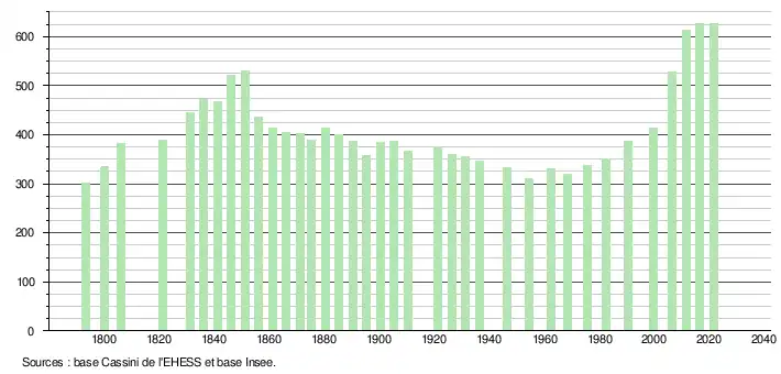 L'évolution du nombre d'habitants est connue à travers les recensements de la population effectués dans la commune depuis 1793. Pour les communes de moins de 10 000 habitants, une enquête de recensement portant sur toute la population est réalisée tous les cinq ans, les populations légales des années intermédiaires étant quant à elles estimées par interpolation ou extrapolation[17]. Pour la commune, le premier recensement exhaustif entrant dans le cadre du nouveau dispositif a été réalisé en 2006[18].