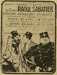 Lors des élections législatives de 1914, Sabatier se présente dans la 2e circonscription du 18e arrondissement, correspondant à son quartier de Clignancourt, où 20 autres candidats briguent le siège de député occupé depuis 1893 par le socialiste Gustave Rouanet[12]. « Candidat républicain socialiste », mais sans investiture du Parti républicain-socialiste, Sabatier se prononce pour la représentation proportionnelle, pour la loi des trois ans, ce qui le classe plus à droite qu'à gauche, et pour l'impôt sur le revenu[13]. Dépourvu du soutien d'un parti, Sabatier fait campagne avec des moyens limités mais parvient à se distinguer grâce à ses affiches originales, illustrées par son ami Poulbot[14],[15].
