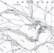 Avant la construction du barrage hydro-électrique Des Joachims en 1950, le site était une presqu'île. La montée des eaux a inondé l'ancien lit de la rivière passant au nord par le lac McConnell[2].