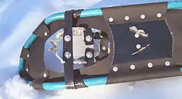 Une série de sangles, généralement trois, sont utilisées pour maintenir le pied sur la raquette. Certains types de fixation comprennent une cuvette pour les orteils. Il est important de pouvoir manipuler ces attaches facilement car les défaire s'effectue en extérieur, par temps froid et avec les mains nues, avec des risques de gelure.