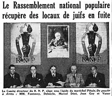 Le Rassemblement national populaire (RNP) est un parti politique français fasciste et collaborationniste, fondé par Marcel Déat pendant l'occupation allemande. Le RNP, qui a existé du jusqu'en 1944, avait une ligne politique néo-socialiste et embrassait le projet d'Europe nazie unifiée[5]. Il se destinait ainsi à « protéger la race ».