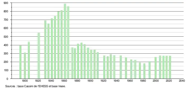 L'évolution du nombre d'habitants est connue à travers les recensements de la population effectués dans la commune depuis 1793. Pour les communes de moins de 10 000 habitants, une enquête de recensement portant sur toute la population est réalisée tous les cinq ans, les populations légales des années intermédiaires étant quant à elles estimées par interpolation ou extrapolation[16]. Pour la commune, le premier recensement exhaustif entrant dans le cadre du nouveau dispositif a été réalisé en 2006[17].