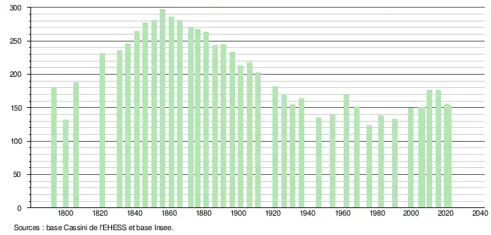 L'évolution du nombre d'habitants est connue à travers les recensements de la population effectués dans la commune depuis 1793. Pour les communes de moins de 10 000 habitants, une enquête de recensement portant sur toute la population est réalisée tous les cinq ans, les populations légales des années intermédiaires étant quant à elles estimées par interpolation ou extrapolation[20]. Pour la commune, le premier recensement exhaustif entrant dans le cadre du nouveau dispositif a été réalisé en 2005[21].