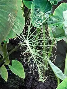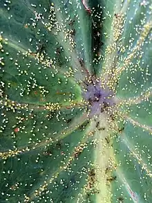 - Aphis gossypii et Myzus persicae, ces pucerons peuvent se rencontrer en pullulation sur la face inférieure des feuilles. Ils sont des vecteurs potentiels du virus de la mosaïque du taro[2],[3].