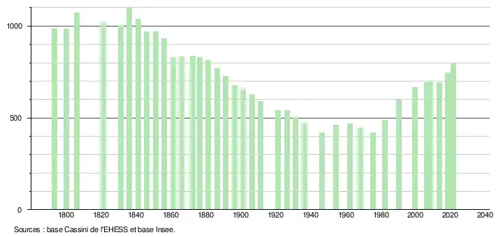 L'évolution du nombre d'habitants est connue à travers les recensements de la population effectués dans la commune depuis 1793. Pour les communes de moins de 10 000 habitants, une enquête de recensement portant sur toute la population est réalisée tous les cinq ans, les populations légales des années intermédiaires étant quant à elles estimées par interpolation ou extrapolation[23]. Pour la commune, le premier recensement exhaustif entrant dans le cadre du nouveau dispositif a été réalisé en 2008[24].