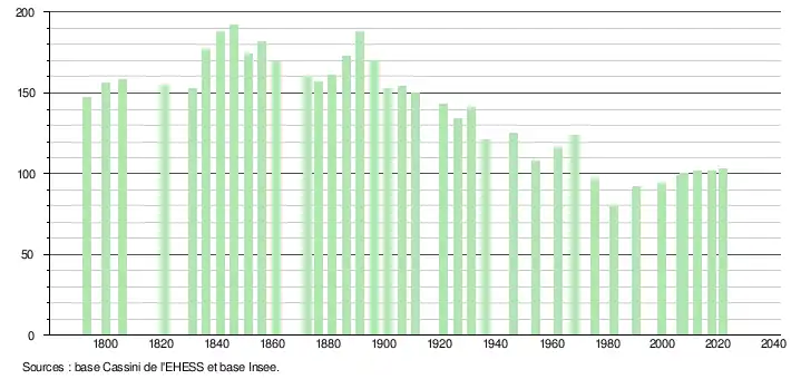 L'évolution du nombre d'habitants est connue à travers les recensements de la population effectués dans la commune depuis 1793. Pour les communes de moins de 10 000 habitants, une enquête de recensement portant sur toute la population est réalisée tous les cinq ans, les populations légales des années intermédiaires étant quant à elles estimées par interpolation ou extrapolation[15]. Pour la commune, le premier recensement exhaustif entrant dans le cadre du nouveau dispositif a été réalisé en 2007[16].