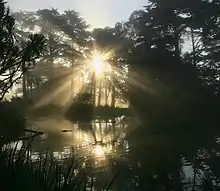 L'effet Tyndall (diffusion de la lumière par les aérosols atmosphériques) permet de visualiser le trajet des rayons crépusculaires[1].