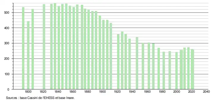 L'évolution du nombre d'habitants est connue à travers les recensements de la population effectués dans la commune depuis 1793. Pour les communes de moins de 10 000 habitants, une enquête de recensement portant sur toute la population est réalisée tous les cinq ans, les populations légales des années intermédiaires étant quant à elles estimées par interpolation ou extrapolation[37]. Pour la commune, le premier recensement exhaustif entrant dans le cadre du nouveau dispositif a été réalisé en 2005[38].