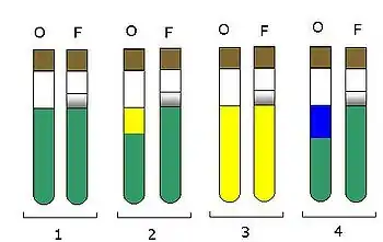 Dans le milieu Hugh et Leifson auquel on ajoute du glucose, on cherche le métabolisme de la bactérie. Le milieu est régénéré (il a été maintenu en surfusion pour que les gaz dissous dans le milieu s'en échappent). Il possède donc un gradient de concentration en dioxygène (l'O2 est plus abondant en surface qu'en profondeur). Les bactéries qui utilisent le glucose produisent des acides. La visualisation des productions d'acide est indiquée par le changement de couleur du bleu de bromothymol, indicateur coloré de pH contenu dans le milieu. À la fin de l'incubation, on observe le changement de couleur du milieu pour déterminer le type oxydatif ou fermentatif.