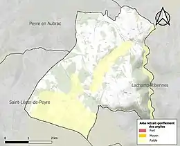 Le retrait-gonflement des sols argileux est susceptible d'engendrer des dommages importants aux bâtiments en cas d’alternance de périodes de sécheresse et de pluie. Aucune partie du territoire de la commune n'est en aléa moyen ou fort (15,8 % au niveau départemental et 48,5 % au niveau national). Sur les 94 bâtiments dénombrés sur la commune en 2019, aucun n'est en aléa moyen ou fort, à comparer aux 14 % au niveau départemental et 54 % au niveau national. Une cartographie de l'exposition du territoire national au retrait gonflement des sols argileux est disponible sur le site du BRGM[18],[Carte 2].
