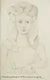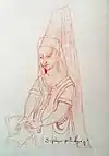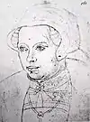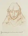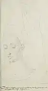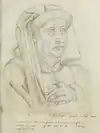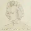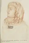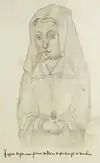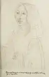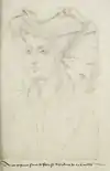 - Albert Châtelet (p. 401) estime à juste titre que la femme représentée ici est Marguerite d'Écosse et non, comme l'indique l'inscription, Charlotte de Savoie. Ce dessin et le précédent, où l'on voit un Louis XI très jeune, ont probablement été copiés d'un même tableau de dévotion ou retable réalisé avant la mort de Marguerite, quand le dauphin n'avait qu'une vingtaine d'années.