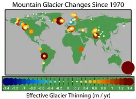 Le recul des glaciers depuis 1850, ou plutôt le « recul du front des glaciers[1] », est mondial et rapide ; il affecte l'accès à l'eau douce pour l'irrigation et pour l'utilisation domestique, les loisirs de montagne, les animaux et les plantes qui dépendent de la fonte des glaciers, et à plus long terme, le niveau des océans. Les montagnes à mi-latitude telles que l'Himalaya, les Alpes, les montagnes Rocheuses, la chaîne des Cascades et les Andes méridionales, aussi bien que les sommets tropicaux isolés tels que le Kilimandjaro en Afrique, montrent des pertes glaciaires proportionnées qui sont parmi les plus grandes[2],[3].