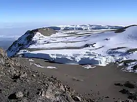 Avec le continent Africain presque en entier dans les zones de climat tropical et subtropical, les glaciers y sont limités à deux crêtes isolées et à la chaîne de montagnes de Rwenzori. Le Kilimandjaro, à 5 892 m, est le point culminant du continent. Depuis 1912, la couverture du glacier du sommet du Kilimandjaro a apparemment reculé de 75 %, et son volume de glace a diminué de 80 % par rapport à ce qu'il était il y a un siècle, tout cela étant dû à son recul et à son amincissement[48]. Dans la période de 14 ans de 1984 à 1998, une section du glacier au sommet de la montagne a reculé de 300 m[49]. Une étude de 2002 a déterminé que si les conditions actuelles continuent, les glaciers au sommet du Kilimandjaro disparaîtront à un moment entre 2015 et 2020[50],[51]. Un rapport de a indiqué qu'il ne reste presque plus de glace sur la montagne, et c'est la première fois en 11 000 ans que la terre nue est apparue sur des parties du sommet[52],[53].