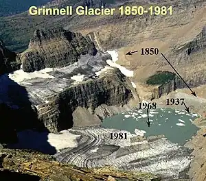 Sur les pentes abritées des crêtes les plus élevées du Parc national de Glacier au Montana, ses glaciers éponymes diminuent rapidement. Le National Park Service et le US Geological Survey ont constitué des plans de chaque glacier depuis des décennies. En comparant les photographies prises au milieu du XIXe siècle aux images contemporaines, on constate de manière évidente que les glaciers du parc ont reculé notablement depuis 1850. Des photographies répétées, pendant des décennies depuis cette époque, montrent clairement que les glaciers dans tout le parc, par exemple le glacier de Grinnell, reculent. Les glaciers plus grands ont maintenant approximativement un tiers de la taille qu'ils avaient en 1850, et des nombreux glaciers plus petits ont complètement disparu. En 1993, 27 % seulement de la zone de 99 km2 du Parc national de Glacier qui était couverte par des glaciers en 1850 restait couverte de glace[32]. Les chercheurs pensent que, d'ici 2030, la majeure partie de la zone glaciaire du Parc National de Glacier aura disparu à moins que les modèles courants du climat n'inversent leur cours[33]. Le glacier de Grinnell est juste un de ces nombreux glaciers du Parc national de Glacier qui sont bien documentés par des photographies depuis de nombreuses décennies. Les photographies ci-dessous démontrent clairement le recul de ce glacier depuis 1938.