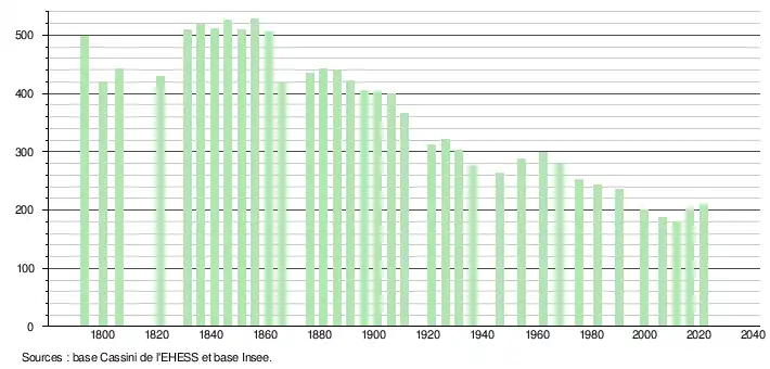 | L'évolution du nombre d'habitants est connue à travers les recensements de la population effectués dans la commune depuis 1793. Pour les communes de moins de 10 000 habitants, une enquête de recensement portant sur toute la population est réalisée tous les cinq ans, les populations légales des années intermédiaires étant quant à elles estimées par interpolation ou extrapolation[24]. Pour la commune, le premier recensement exhaustif entrant dans le cadre du nouveau dispositif a été réalisé en 2006[25]. En 2021, la commune comptait 210 habitants[Note 5], en augmentation de 8,25 % par rapport à 2015 (Hautes-Pyrénées : +1,04 %, France hors Mayotte : +1,84 %). |