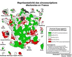 L'aboutissement logique est l'avantage de la gauche dans l'actuel découpage. Ainsi, selon les chiffres INSEE de population publiés au début de [5] et redistribués en circonscriptions de 1986 et selon les résultats des élections législatives de 2007[7], 25 % des plus peuplées sont représentées à l'Assemblée par 45 députés de gauche, 2 divers (Mayotte et Martinique) et 97 favorables à la majorité présidentielle de l'époque. À l'opposé du spectre démographique, sur le quart des circonscriptions les moins peuplées, 70 ont envoyé à la Chambre un élu de gauche, 1 a envoyé un MoDem et 73 un élu de droite. Pour mémoire, le total national était en 2007 de 227 de gauche, 3 divers, 4 MoDem et 343 de droite[8]. La droite est donc sous-représentée parce qu'elle est élue dans la grande majorité des circonscriptions les plus peuplées, et la gauche sur-représentée grâce aux moins peuplées.