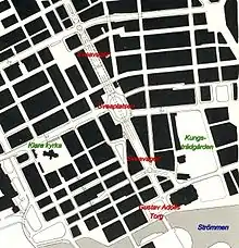 En 1866, un plan général destiné à donner à Norrmalm air, lumière et verdure est défini par une commission dirigée par le juriste Albert Lindhagen, à laquelle participe notamment le lieutenant-général Fredrik Wilhelm Leijonancker, qui est à l'origine du réseau de distribution d'eau de Stockholm. La commission propose un réseau de rues en damier définissant de vastes ilots carrés, entourés de larges boulevards, qui s'inspire des travaux réalisés par Georges Eugène Haussmann à Paris, mais où l'influence de Saint-Pétersbourg se fait également sentir[13],[14]. On prévoit entre autres de faire de la rue Sveavägen un boulevard large de 70 m, à l'image du boulevard de Sébastopol'de Paris ou de l'avenue Unter den Linden de Berlin[15]. Ce boulevard s'étendrait du lac Brunnsviken au nord à la place Gustav Adolfs torg au sud, sans se soucier ni des constructions existantes ni du relief, en passant notamment au travers de l'église Adolphe-Frédéric, de la place Hötorget et de la place Brunkebergstorg. Dans la direction est-ouest, une connexion entre le pont de Lidingö et Traneberg est proposée[16].
