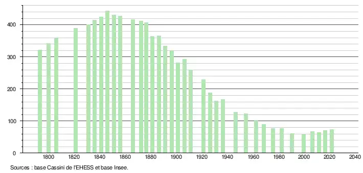 L'évolution du nombre d'habitants est connue à travers les recensements de la population effectués dans la commune depuis 1793. Pour les communes de moins de 10 000 habitants, une enquête de recensement portant sur toute la population est réalisée tous les cinq ans, les populations légales des années intermédiaires étant quant à elles estimées par interpolation ou extrapolation[16]. Pour la commune, le premier recensement exhaustif entrant dans le cadre du nouveau dispositif a été réalisé en 2006[17].