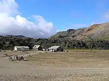 Le refuge vu depuis les sources chaudes de Landmannalaugar.