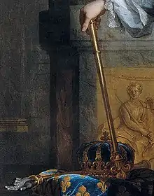 . Contrairement à ses trois prédécesseurs directs, Louis XVI est sacré à l'âge adulte de 21 ans, le . La couronne d'or fut réalisée par l'orfèvre du roi, Auguste, qui la réalisa en or de 22 carats (poids total de 1345 g) pour un peu plus de 4016 livres (plus 150 livres pour l'écrin de maroquinerie pour la couronne)[18]. La couronne d'or est formée d'un bandeau enrichi d'ornements, de pierres précieuses (non détaillées) et cerné de perles dorées, et surmontée de fleur-de-lys reliés par des ornements, dont s'échappaient des diadèmes (branches dont la forme évoque les diadèmes de lauriers antiques) en feuilles d'acanthe, sur lesquels se trouvent des perles. Les diadèmes se réunissent au sommet de la couronne pour former une sorte de chapiteau, sur lequel on trouve une double fleur-de-lys. Elle avait un bonnet intérieur cramoisi brodé d'or[21]. On la reconnaît derrière le roi sur le célèbre portrait d'Antoine-François Callet.