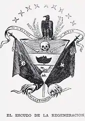 Alfredo Greñas a réalisé l'une des premières caricatures du blason national. Il y résume de manière critique la Regeneración : le condor, l'un des emblèmes de la Colombie, ferme ses ailes et est enchaîné. Neuf étoiles, qui s'avèrent être des crânes, correspondent en fait à la division géographique des neuf départements composant les États-Unis de Colombie et un ruban proclame « Ni liberté, ni ordre ». Dans une première barrette apparaît un crâne et deux tibias. Dans une seconde barrette, le pouvoir du clergé est représenté et dans la dernière, un caïman (représentation des États-Unis) mange le canal de Panama[6].