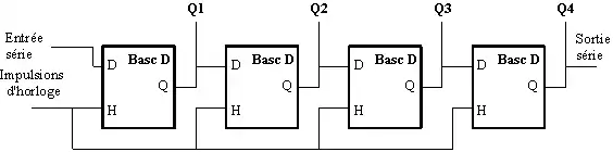- SISO (Serial In - Serial Out) : à chaque cycle d'horloge, on ne peut écrire que dans une bascule (lorsque deux bascules ne sont pas reliées entre elles, c'est celle dont l'entrée n'est pas reliée à une autre bascule), et on ne peut lire qu'une autre (lorsque deux bascules ne sont pas reliées entre elles, c'est celle dont la sortie n'est pas reliée à une autre bascule) ;