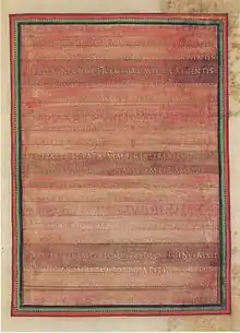 Cette double-page de début est faite d'un parchemin de vélin plus épais que le manuscrit et servait peut-être de couverture au parchemin[2]. Elle mesure 37,5 cm sur 29,5 cm et contient au folio 1 recto le poème de dédicace à l'archevêque Egbert écrit en lettres d'or sur fond pourpre: