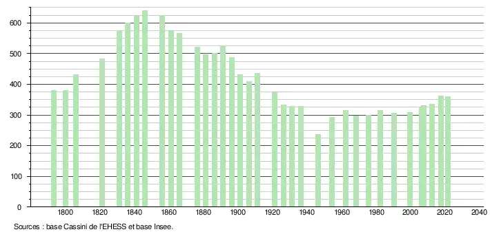 L'évolution du nombre d'habitants est connue à travers les recensements de la population effectués dans la commune depuis 1793. Pour les communes de moins de 10 000 habitants, une enquête de recensement portant sur toute la population est réalisée tous les cinq ans, les populations légales des années intermédiaires étant quant à elles estimées par interpolation ou extrapolation[23]. Pour la commune, le premier recensement exhaustif entrant dans le cadre du nouveau dispositif a été réalisé en 2007[24].