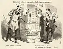 - 1866 : contre la Prusse qui s'oppose à l'Autriche dans l'administration des duchés. L'assemblée confédérale vote la Bundesexekution le et rejette le mémoire justificatif de la Prusse le , entraînant la guerre austro-prussienne et la dissolution de la Confédération, proclamée le [4]. Plusieurs États allemands alliés de la Prusse refusent l'ordre de Bundesexekution et forment avec celle-ci la Confédération de l'Allemagne du Nord[5].