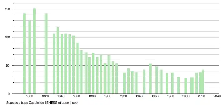 L'évolution du nombre d'habitants est connue à travers les recensements de la population effectués dans la commune depuis 1793. Pour les communes de moins de 10 000 habitants, une enquête de recensement portant sur toute la population est réalisée tous les cinq ans, les populations légales des années intermédiaires étant quant à elles estimées par interpolation ou extrapolation[26]. Pour la commune, le premier recensement exhaustif entrant dans le cadre du nouveau dispositif a été réalisé en 2008[27].