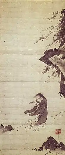 Pour les moines zen, la peinture, et notamment la peinture de paysage, est l'un des plus sûrs moyens de parvenir à l'illumination. On ne peut donc s'étonner de constater qu'entre le XIVe et le XVIe siècle, la quasi-totalité des peintres qui s'illustrent dans le paysage au lavis, et ils sont nombreux, sont des moines. Au XIIIe siècle, l'influence continentale, si déterminante quatre cents ans plus tôt, ne joue plus guère, même si elle est en passe de s'affirmer à nouveau. S'ils préfèrent s'essayer d'abord à l'art intimiste du paysage rapproché, ils s'adonnent volontiers à ces zenkizu (images évoquant les activités familières des bonzes zen) qui enchantent les sages chinois[2]. Reisai nous donne déjà de ces scènes, une vision plus stylisée lorsqu'il peint les deux compères Kanzan et Jittoku (les célèbres moines-clochards de la tradition chinoise), modèles de prédilection de nombreux peintres nippons[3].