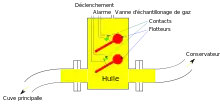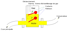 - Si un arc se forme, l'accumulation de gaz est rapide, et l'huile s'écoule rapidement dans le conservateur. Cet écoulement d'huile actionne un commutateur fixé à une palette située dans le chemin de circulation d'huile. Ce commutateur actionnera normalement un disjoncteur pour arrêter (isoler) l'appareil avant que le défaut ne crée plus de dommages.