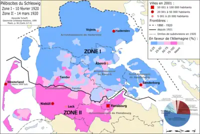 En 1919, le traité de Versailles prévoit deux plébiscites du Schleswig. Le premier eut lieu le et le second le . À la suite des résultats du plébiscite, le nord du Schleswig fut transféré au Danemark tandis que la partie centrale et méridionale du Schleswig fut maintenu en Allemagne. La frontière ainsi tracée toujours actuelle.