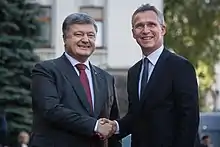 Le , le parlement ukrainien vote à une majorité de 334 sur 385 la modification de la constitution ukrainienne afin d'aider l'Ukraine à rejoindre l'OTAN et l'Union européenne[43]. Après le vote, le président ukrainien Porochenko déclare : « C'est le jour où le mouvement de l'Ukraine vers l'Union européenne et l'Alliance de l'Atlantique Nord sera consolidé dans la Constitution en tant que repère politique étranger »[44].