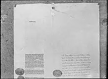 Un monument de pierre datant de 823 et exposant les termes du traité de paix sino-tibétain de 822 peut être encore vu devant le temple de Jokhang dans le quartier du Barkhor à Lhassa. Sur ce monument, le traité d'amitié, rédigé à la fois en tibétain et en chinois est gravé[8] et s'avère quelque peu difficile à interpréter. Les rapports entre les deux pays paraissent avoir été complexes. D'une part, le texte décrit les relations entre la Chine et le Tibet comme semblables à celles entre un oncle et son neveu. La dynastie Tang de Chine et la dynastie Yarlung du Tibet ont été liées par mariage, cependant les termes d'oncle et de neveu ne sont pas utilisés par rapport aux autres groupes avec qui les Chinois ont eu des relations par mariage. Cette terminologie correspondait à une phraséologie diplomatique impliquant des relations amicales comme au sein d'une famille[9]. D'autre part, le texte reproduit, décrit les deux pays comme égaux. Le texte a été publié à plusieurs reprises[10],[11],[12],[13].