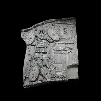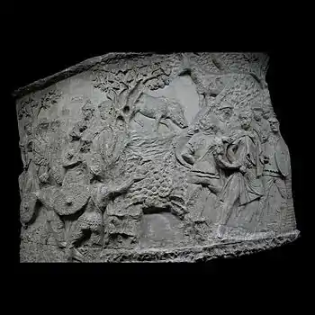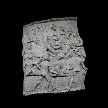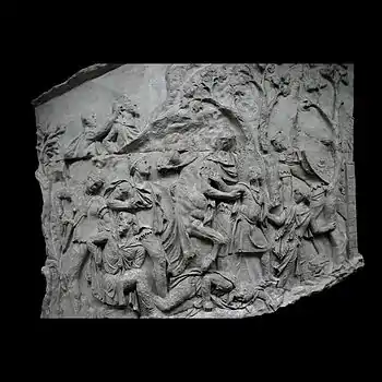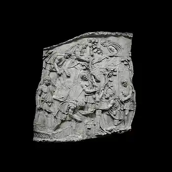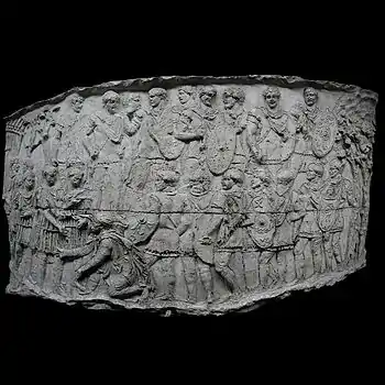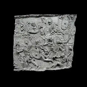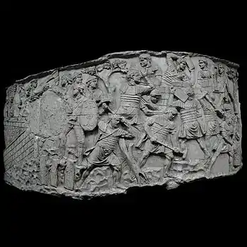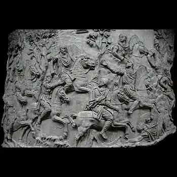 | XLII | Bataille d'Adamclisi[a 6] La cavalerie romaine engage le combat contre les Daces qui ont pris position sur une colline, tandis que les légions attaquent de front, soutenues par des auxiliaires germains. L'armée dace, défaite, tente de fuir à travers les bois. Le chemin est couvert de morts et de blessés. |