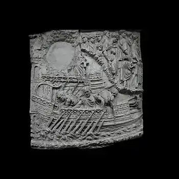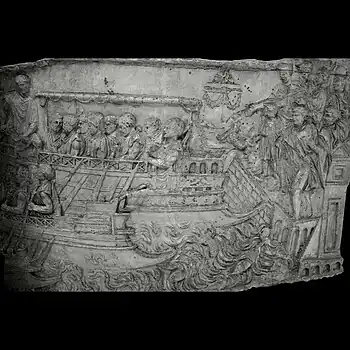| XXXV | À gauche, en bas, la birème impériale est manœuvrée par l'empereur et son lieutenant, installés devant la cabine de la poupe et qui manient eux-mêmes les timons[51]. Au-dessus, une deuxième birème avance, dont l'équipage comprend un timonier, six rameurs et le hortator. La proue des birèmes est ornée d'un éperon (rostrum) et d'un acrostole. Celle de la birème impériale est davantage ouvragée et on distingue, sculptés, des Amours et des monstres marins. Débarquement des légions[48] À droite, les légions romaines débarquent à Oescus et Novae. L'empereur et sa suite ont mis pied à terre et se dirigent vers la ville. |