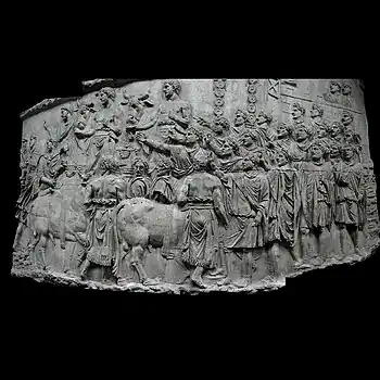 Lustratio exercitus Avant de partir en campagne ou d'engager un combat, les armées romaines viennent se faire purifier durant la cérémonie du lustratio durant laquelle sont sacrifiés les Suovetaurilia (un porc, un mouton et un taureau). Des haruspices interprètent alors les entrailles des animaux sacrifiés pour connaître la volonté des dieux. Les écuyers de l'empereur se sont arrêtés sous un bouquet de chênes, tenant le cheval de Trajan par la bride. Un écuyer porte un deuxième fanion au bout d'une lance. À droite, en arrière-plan, on aperçoit l'entrée du camp romain dans lequel ont été dressées des tentes pour l'état-major. Devant les remparts s'avance l'égorgeur (cultrarius), reconnaissable par son tablier qui lui laisse la poitrine nue et ses deux couteaux rangés dans un même fourreau. À côté de lui, un de ses assistants tient un vase contenant l'eau lustrale, un autre une cassolette avec de l'encens. En arrière, les spectateurs assistent à la cérémonie avec recueillement. |