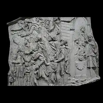 | XXXIX | Soumission de Daces Cette scène, particulièrement chargée, pourrait être la contraction de quatre scènes : l'ambassade de Princes daces, leur soumission, la construction d'un fortin et la capture d'espions ennemis (visible sur la scène suivante). Cette contraction (le dessin originel des reliefs prévoyait peut-être quatre scènes distinctes) a pu être opérée pour que d'autres scènes clés coïncident sur un axe vertical de la colonne, permettant une lecture synthétique des reliefs[52]. En haut, trois princes daces, suivis d'un cortège de femmes et de vieillards, viennent invoquer la clémence de Trajan au côté duquel se tient Licinius Sura[53]. À droite, en contrebas, des légionnaires fortifient un camp. |