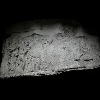 | XXXVIII | Bataille nocturne de Nicopolis Tout à fait à gauche, on distingue le buste de la Nuit (Nox) qui se drape de son châle, indiquant que la scène se déroule à la nuit tombée. Les Romains, secondés par des auxiliaires germains (torse nu et armés de massues), attaquent les Daces par surprise[48]. En arrière, on aperçoit les chariots daces chargés de butin qui les empêchent de manœuvrer rapidement. La ville de Nicopolis ad Istrum est fondée plus tard par Trajan à proximité du lieu de la bataille[48]. Son nom célèbre cette victoire[a 4],[a 5]. |