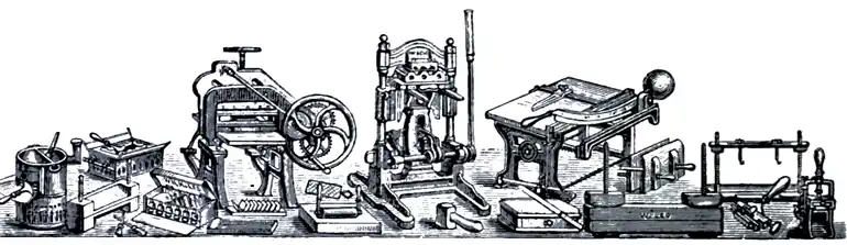 Plusieurs machines font leur apparition dans les années 1840, permettant de faciliter le travail des relieurs : la cisaille à cartons mise au point vers 1845 par Warer de la Rue[25] ; le massicot, inventé par le mécanicien Massiquot en 1849 et qui permet de rogner toute la tranche d'un livre d'un seul coup plutôt que page à page avec le fût à rogner[23] ; l'étau à endosser dit « étau à l'anglaise », inventé par les Anglais à la fin de la première moitié du XIXe siècle, qui remplace rapidement le système des ais ferrés[25]. Si l'étau à endosser est rapidement adopté chez la plupart des relieurs, le massicot effraie encore un grand nombre d'ouvriers des petits ateliers, et ceux-ci lui préfèrent pendant longtemps la presse à rogner traditionnelle, car même si le travail est plus lent, le résultat de la coupe est souvent considéré comme impeccable et mieux contrôlé[23],[37].