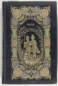 L'art gothique atteint son apogée avec la parution du premier tome des Voyages pittoresques et romantiques dans l'ancienne France en 1820[32], comportant de nombreuses monographies de cathédrales françaises, qui constitue le premier recueil du patrimoine français[32]. Des reliures décorées à la plaque ou aux fleurons inspirés de l'architecture gothique, dites « à la cathédrale » (avec figuration d'ogives, de rosaces, de fenestrages), sont exécutées massivement dans beaucoup d'ateliers[20], dont ceux de Thouvenin, de Simier, puis plus tard d'Antoine Bauzonnet et de son successeur Trautz[33],[34]. Les allures parfois austères des décors aux filets dorés de Bauzonnet, accentuées par les couleurs sombres de ses reliures, ont contrasté avec l'aspect plus riche de celles produites par les autres ateliers[20],[35]. La publication en 1831 de Notre-Dame de Paris apparaît comme le point culminant du goût pour le gothique-romantique[20],[35].