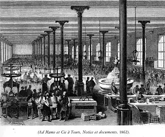 Entre 1820 et 1840, la profession de relieur, qui regroupe des ouvriers capables d'effectuer toutes les tâches de la reliure, est scindée en plusieurs ateliers différents[36] : l'atelier du relieur, celui du doreur sur cuir, celui du doreur sur tranches, celui du marbreur ou encore celui du lamineur chargé de battre les cartons et les cahiers[36].