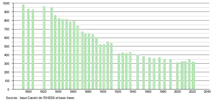 L'évolution du nombre d'habitants est connue à travers les recensements de la population effectués dans la commune depuis 1793. Pour les communes de moins de 10 000 habitants, une enquête de recensement portant sur toute la population est réalisée tous les cinq ans, les populations légales des années intermédiaires étant quant à elles estimées par interpolation ou extrapolation[17]. Pour la commune, le premier recensement exhaustif entrant dans le cadre du nouveau dispositif a été réalisé en 2005[18].
