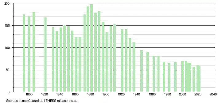 L'évolution du nombre d'habitants est connue à travers les recensements de la population effectués dans la commune depuis 1793. Pour les communes de moins de 10 000 habitants, une enquête de recensement portant sur toute la population est réalisée tous les cinq ans, les populations légales des années intermédiaires étant quant à elles estimées par interpolation ou extrapolation[19]. Pour la commune, le premier recensement exhaustif entrant dans le cadre du nouveau dispositif a été réalisé en 2004[20].
