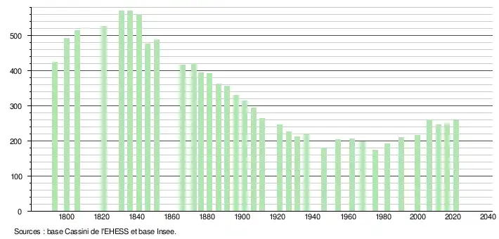 L'évolution du nombre d'habitants est connue à travers les recensements de la population effectués dans la commune depuis 1793. Pour les communes de moins de 10 000 habitants, une enquête de recensement portant sur toute la population est réalisée tous les cinq ans, les populations légales des années intermédiaires étant quant à elles estimées par interpolation ou extrapolation[17]. Pour la commune, le premier recensement exhaustif entrant dans le cadre du nouveau dispositif a été réalisé en 2006[18].