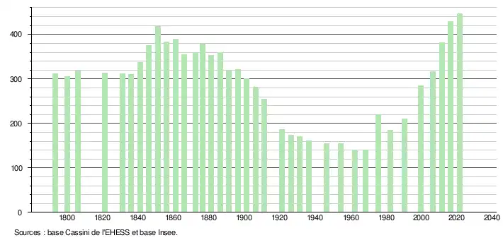L'évolution du nombre d'habitants est connue à travers les recensements de la population effectués dans la commune depuis 1793. Pour les communes de moins de 10 000 habitants, une enquête de recensement portant sur toute la population est réalisée tous les cinq ans, les populations légales des années intermédiaires étant quant à elles estimées par interpolation ou extrapolation[18]. Pour la commune, le premier recensement exhaustif entrant dans le cadre du nouveau dispositif a été réalisé en 2006[19].