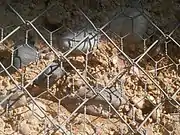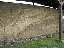 Le rempart est constitué d'un premier talus en argile, large d'environ 10 m à sa base, avec des inclusions de charbon de bois et présentant peut-être une armature en bois dans sa partie orientale (côté extérieur de l'oppidum)[13],[14]. Ce talus primitif, qui semble avoir été édifié sous La Tène A ou B1 (, +/- 70[Note 1]), repose sur un sol en terre battue qui scelle une fosse de l'âge du bronze[15], seule structure de cette époque attestée dans cette partie de l'oppidum. Il est impossible de préciser si ce talus primitif s'étend sous toute la longueur du rempart et même s'il s'agit vraiment d'une structure défensive ou bien d'un autre type de construction : d'autres sondages effectués ailleurs sous le rempart donne des résultats contradictoires[L 5].