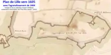 - Blieck et Vanderstraeten listent d'après les comptes de travaux de à les parties suivantes de l'enceinte attestées comme étant construites en terre (dans le sens horaire) : à la porte de Saint-Pierre, derrière la collégiale Saint-Pierre, à la porte de Courtrai, près de la tour du Couvent des Frères Mineurs jusqu'à la porte des Reignaux, au niveau de la porte Saint-Sauveur, près de la porte du Molinel et à la porte de la Barre[9]. Toutes ces sections à l'exception de la porte de la Barre et celle de Courtrai sont attestées comme construites en terre sur un plan des fortifications de Lille fait en 1599 pour servir à des propositions d'agrandissement[10]. Dans le cas des porte de la Barre comme celle de Courtrai, la réalisation d'une courtine maçonnée semble ultérieur, dans le cas de la porte de Courtrai, il se peut cependant que les comptes de travaux se référent à l'ancienne porte de Courtrai qui est remplacée par une autre à la construction du château de Courtrai.
