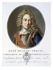 René Trouin, sieur du Gué, dit Duguay-Trouin, né le à Saint-Malo et mort le à Paris, est un corsaire et amiral français. Né dans une famille d'armateurs malouins, il commence sa carrière en 1689 et reçoit, dès 1691, le commandement d'un navire. Son courage, le respect qu'il a gagné auprès de ses hommes, ainsi que ses victoires contre les Anglais et les Hollandais au cours des deux dernières guerres de Louis XIV lui ont assuré une ascension très rapide dans la hiérarchie maritime.